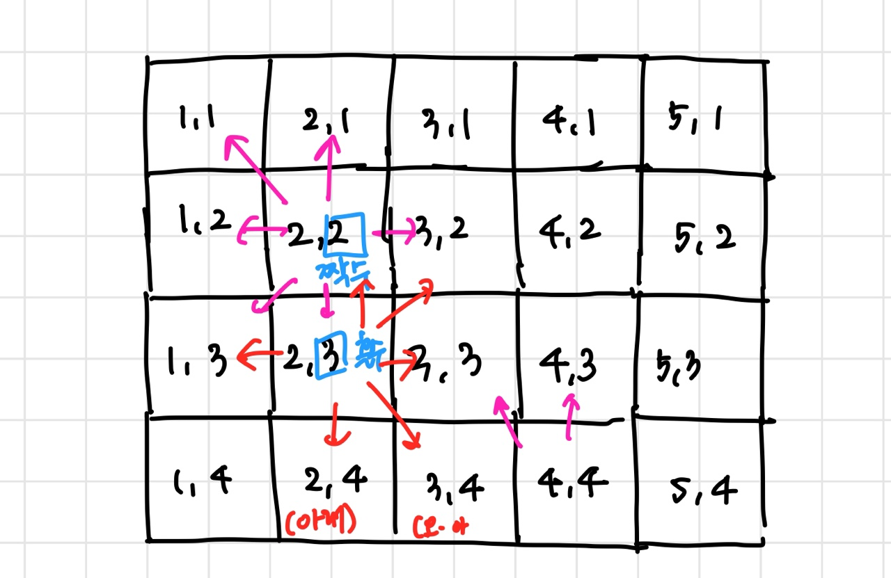 문제에서 입력은 2차원 배열로 주어지지만, 우리가 평소에 생각하던 상하좌우 또는 대각선까지 포함한 8방향을 모두 탐색할 수 없다.