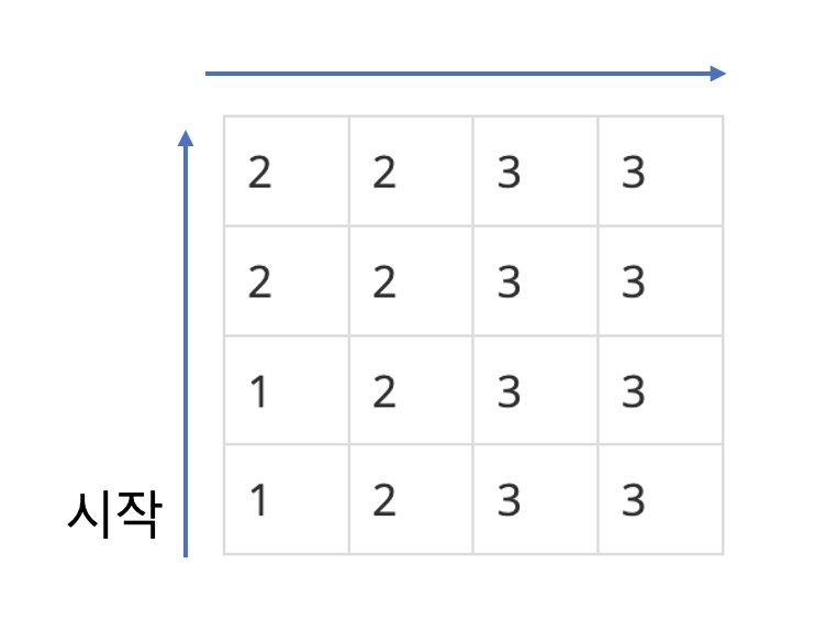 왼쪽 아래에서부터 위, 오른쪽 방향으로 성장한 애벌레의 값을 갱신해주는데, 이 화살표 순서대로 숫자가 작아지지 않는다고 했으므로,