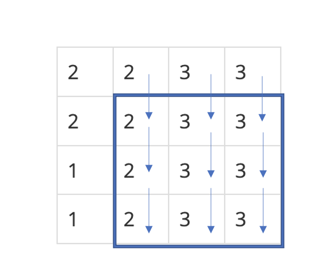 # 모든 입력에서 왼쪽 아래 -> 왼쪽 위 -> 오른쪽 은 감소하지 않으므로, 항상 자기자신의 위칸이 최대 증가