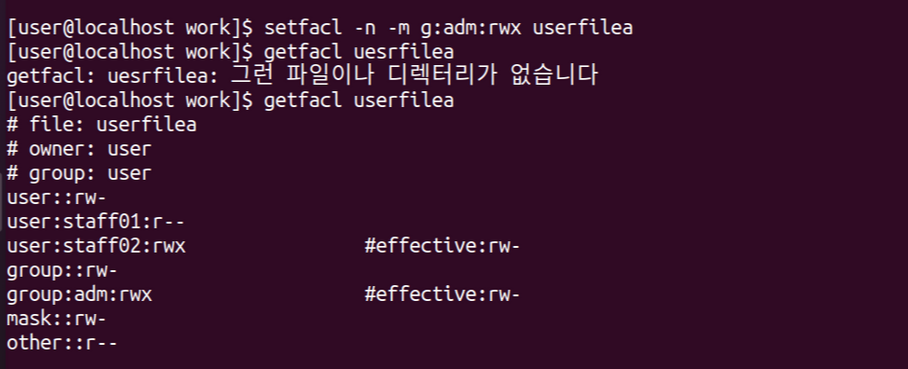 ์์) setfacl -n -m g:adm:rwx userfilea