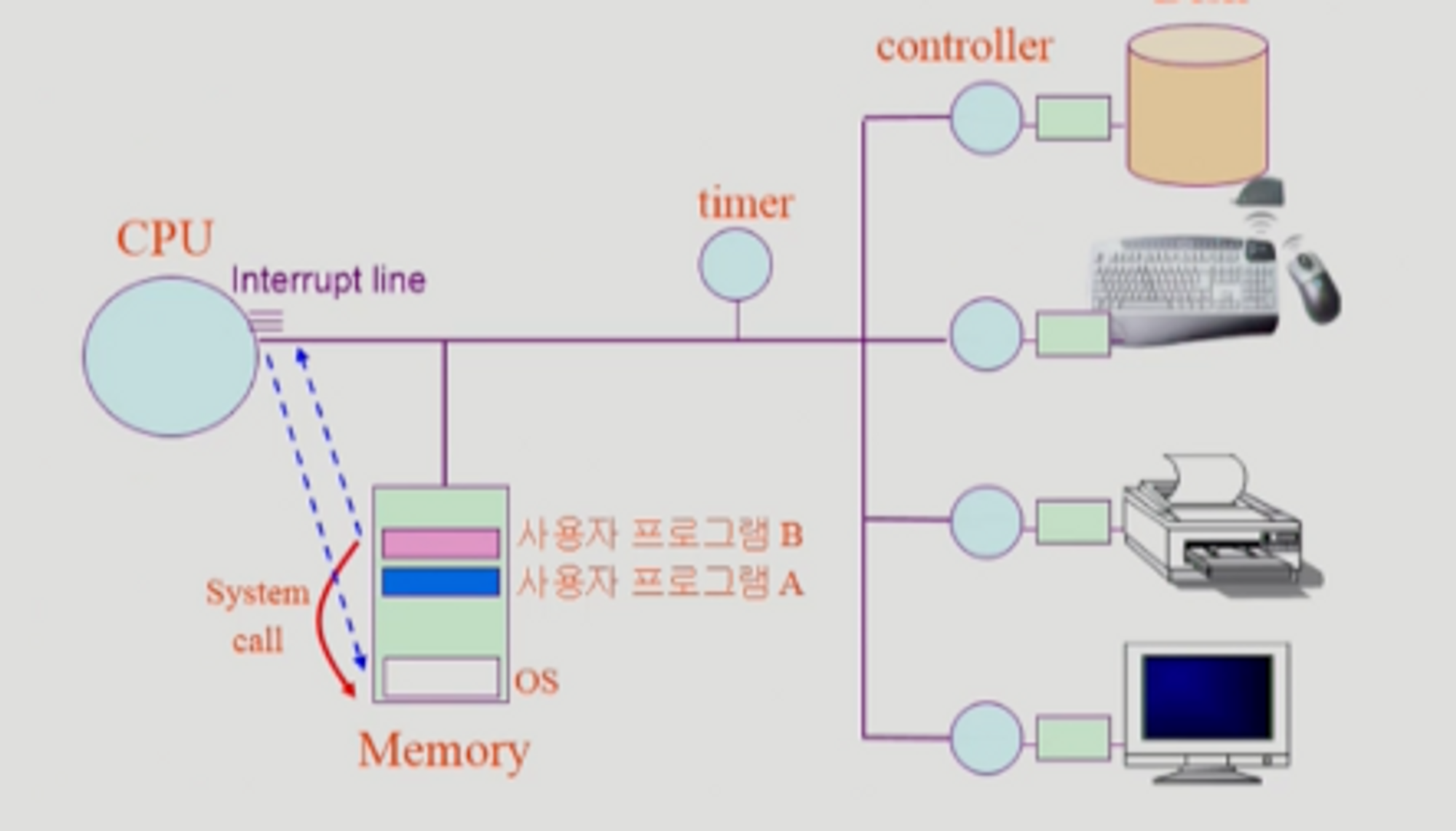 프로그램이 실행 중에 disk 에서 읽어오는 요청(= System Call) 을 하기 위해서 CPU에 인터럽트를 걸 수 있다. → mode bit 가 1에서 0으로 바뀐다. (즉, 사용자모드에서 커널모드로 전환된다.) → CPU제어권이 OS로 넘어간다.(커널모드) → disk device controller에게 요청한다 → I/O 장치에서 작업이 다 끝났으면, 일을 완료했음을 CPU에 알리기 위해서 하드웨어 인터럽트가 발생한다.