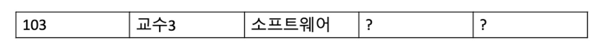 - 삽입 이상 (Insertion Anomaly) : 불필요한 정보를 함께 저장하지 않고서 어떤 정보를 저장하는 것이 불가능 할 때