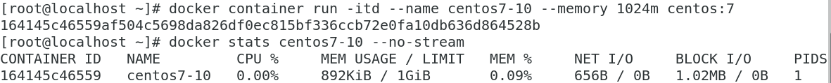 $ docker container run -itd --name centos7-10 --memory 1024m centos:7
