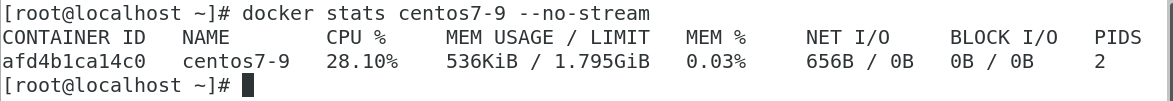 ์ปจํ ์ด๋ centos7-10๋ฅผ ์คํํ ๋ 1024MB์ ํฌ๊ธฐ๋ก ์ ํํ๋ค. stats ๋ก ํ์ธํด๋ณด๋ฉด LIMIT์ ์ฌ์ด์ฆ๊ฐ 1GB๋ก ์ ํ๋ ๊ฒ์ ํ์ธํ ์ ์๋ค.