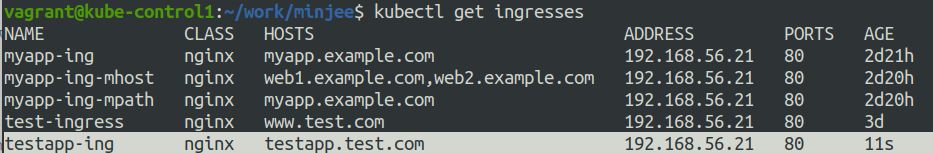 yaml 파일로 인그레스 컨트롤러를 생성후, 인그레스 목록을 확인한다. testapp.test.com FQDN과 할당된 노드의 IP 주소를 확인할 수 있다.