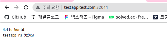 외부 DNS 서버가 없으므로 임시로 host PC의 /etc/hosts 파일에 testapp.test.com 호스트 이름으로 ip 주소를 저장해 두었다.