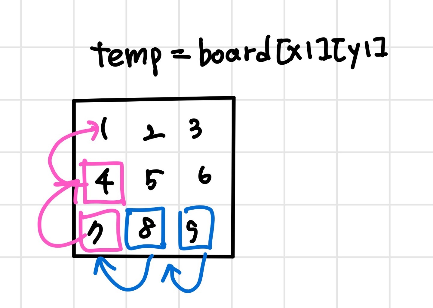 값을 한칸씩 이동시키는 방법은 위의 그림처럼 했다. 왼쪽 ->하단 -> 우측 -> 상단 순서로 한칸씩 값을 이동시켰다. 이동시키면서 min_num 값과 비교해서 최솟값을 갱신해준다.