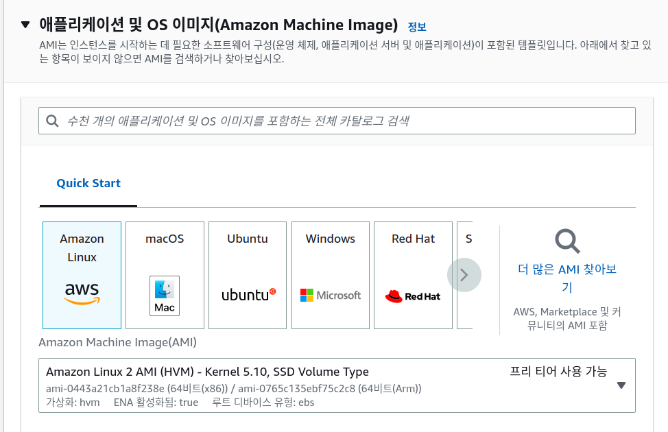 사용할 OS 이미지를 선택할 수 있다. AMI란, Amazon Machine Image로 EC2 인스턴스를 만들 때 사용하는 이미지 파일이다. 기존에 있는 이미지 파일도 사용할 수 있으며, 직접 커스텀한 AMI 이미지 파일도 사용할 수 있다. 나의 경우 Amazon Linux로 프리티어 사용할 수 있는 것으로 설정했다.