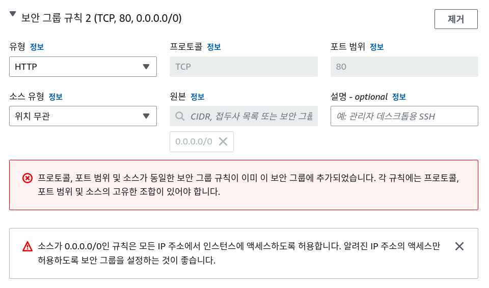 HTTP 통신을 사용할 것이므로, HTTP를 추가해준다. 또한 위치무관(모든 IP에서 접근 허용)을 설정했다. 그런데 나는 이미 기존에 동일한 설정을 한 보안그룹을 생성해 두어서, 새로운 보안 그룹을 생성할 수 없다는 오류가 떴다.