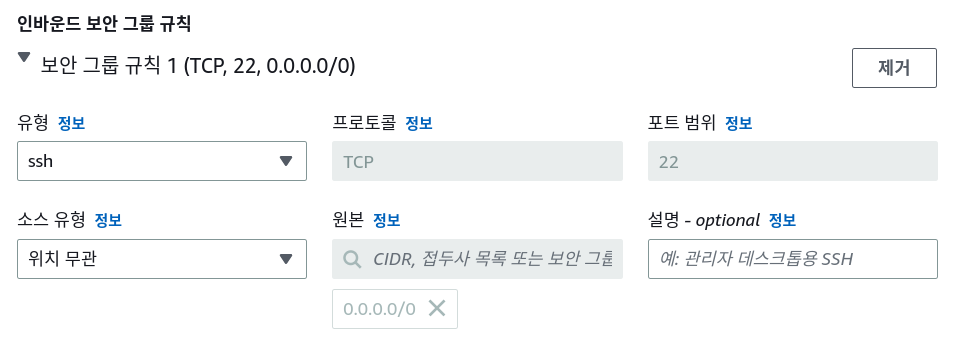 기본값으로 ssh 유형에 대해 설정이 되어 있다. 위치무관으로 설정해서 외부의 모든 IP에서 접근할 수 있도록 설정한다.