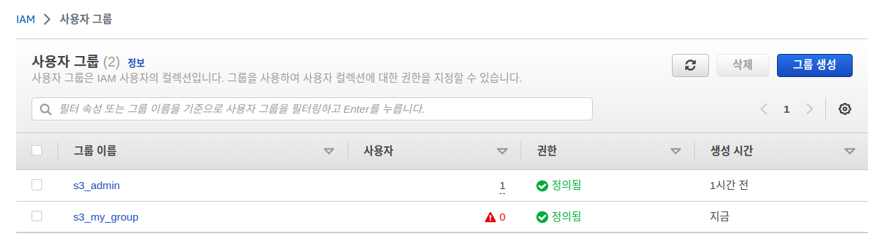 권한 선택 후 생성하면 그룹이 생성된 것을 확인할 수 있다.