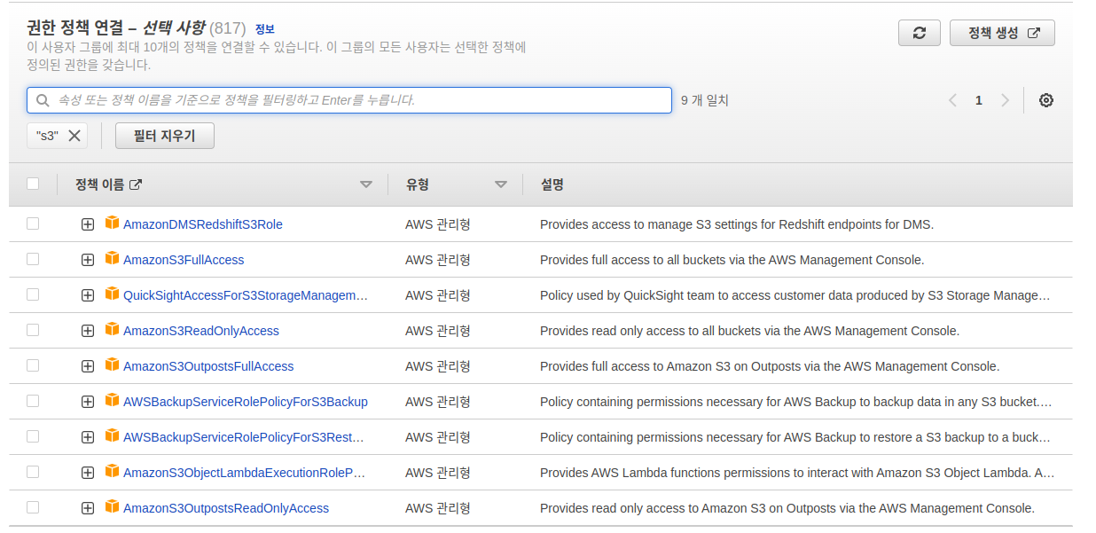 권한 정책 연결에서 S3를 검색하면 관련된 권한 목록을 확인할 수 있다. 이중에서 AmazonS3FullAccess 를 선택한다.