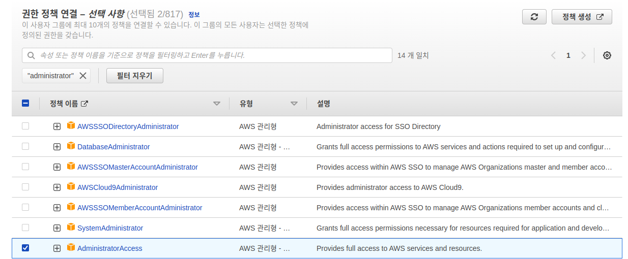 참고로 루트 사용자에 대한 권한 위임은 administrator 로 검색하면 나온다. 이 권한들 중 AdministratorAccess가 루트 사용자의 모든 권한에 대한 것이다.