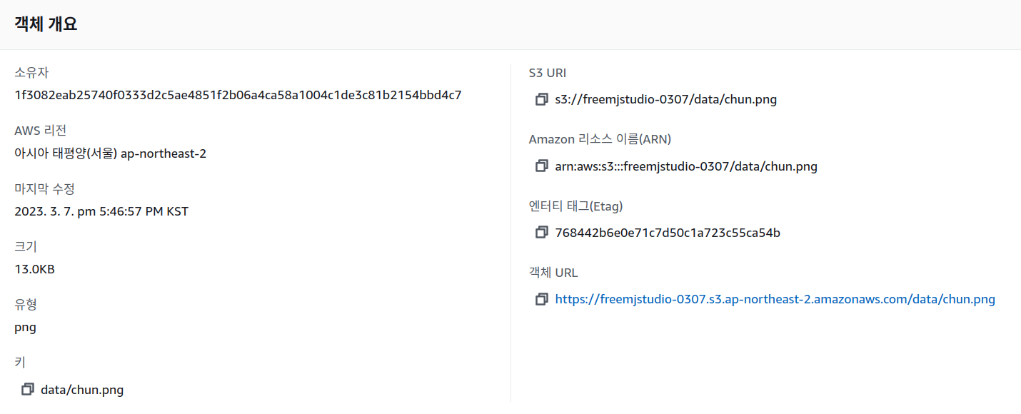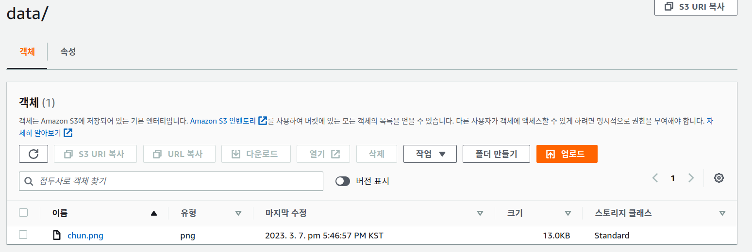 업로드 버튼을 눌러서 사진파일 하나를 S3 Bucket에 올렸다.