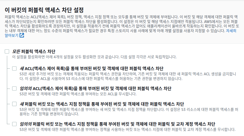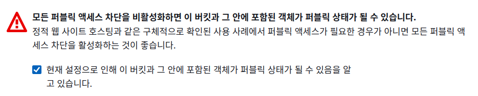 버킷의 퍼블릭 액세스를 차단 해지했다. 외부에서 S3 버킷으로 액세스가 되는 것을 테스트해보기 위해서이다. 하지만 사용목적에 따라 보안상 알맞게 설정해야 할 것이다..