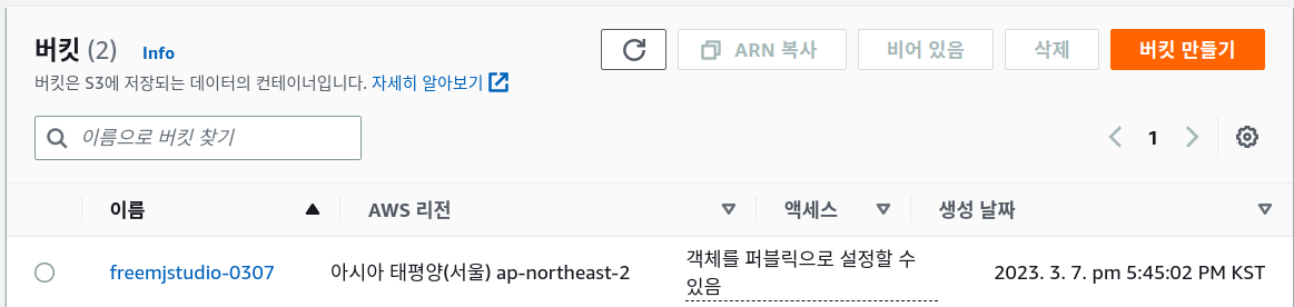 나머지 설정은 디폴트 값으로 설정하고, 버킷을 생성했다 ! 대시보드에서 바로 확인할 수 있다.