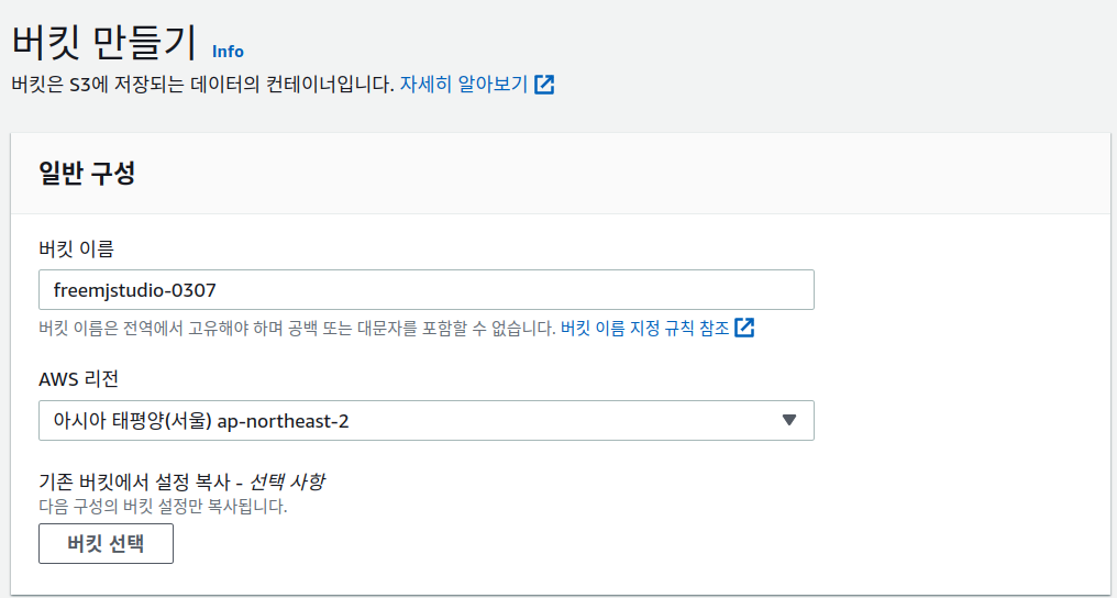 Amazon S3 > 버킷 > 버킷만들기 에서 버킷을 생성한다. 주의할 점은 버킷이름은 모든 region에서 고유한 이름이어야 한다!!