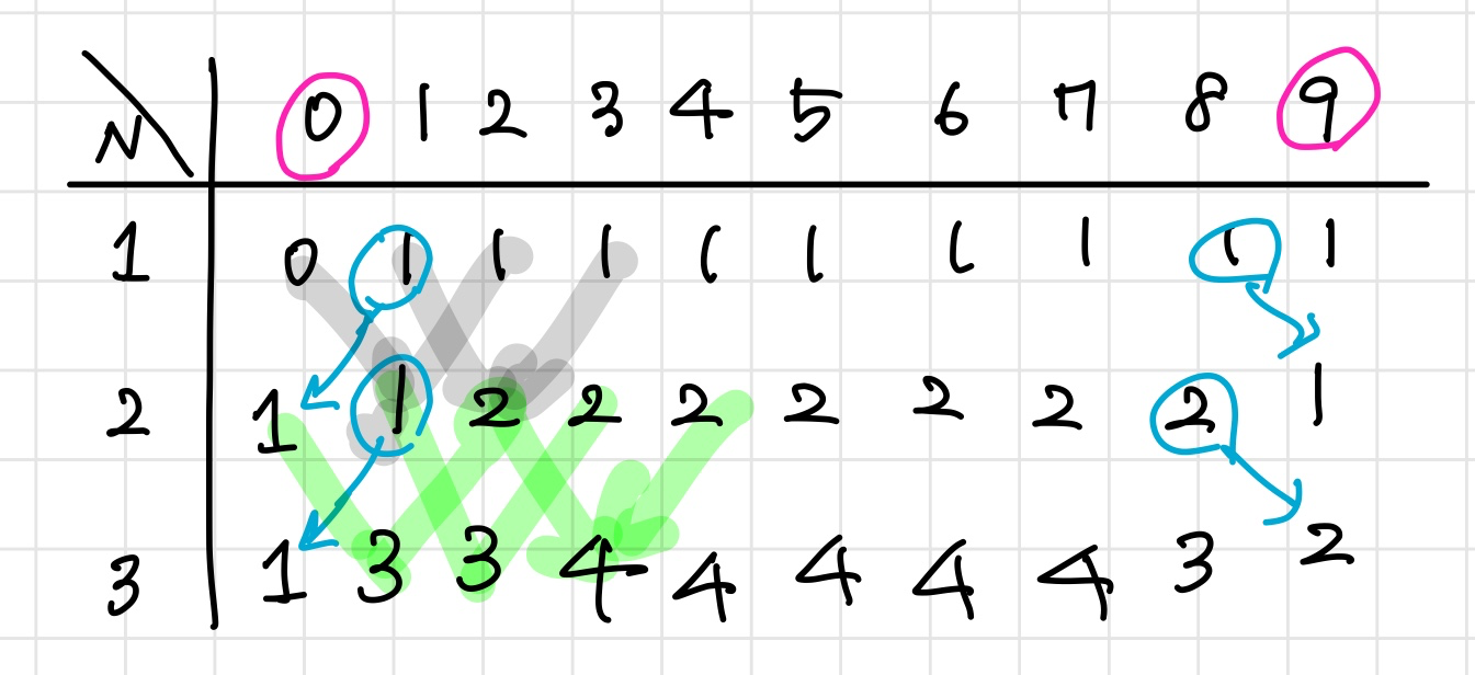 여기서 (0-9)는 맨 끝자리수이고 N은 문제에서와 같이 자리수를 뜻한다.