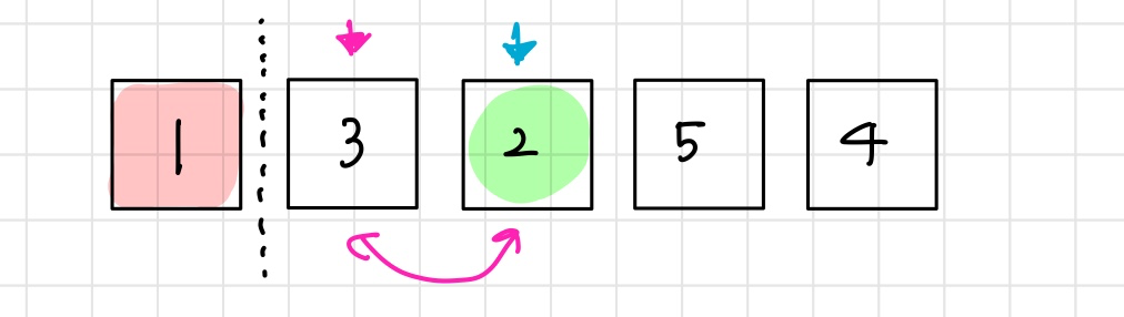 1과 2는 이미 정렬되었으므로 제외한다.그런데 3은 이미 제자리에 와있으므로 교환이 이루어지지 않는다.