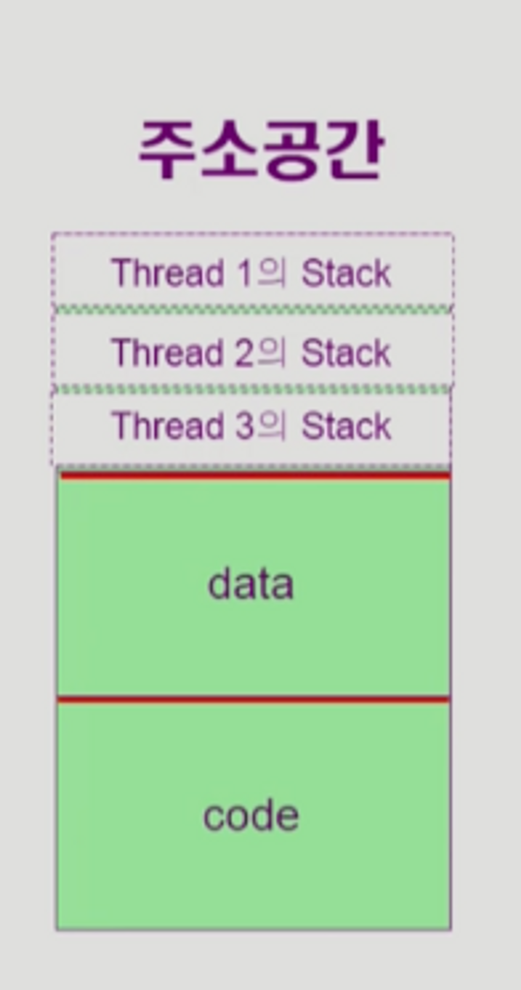 - Thread 가 동료 Thread와 공유하는 부분 (= Task) : 코드 영역, 데이터 영역, OS 자원