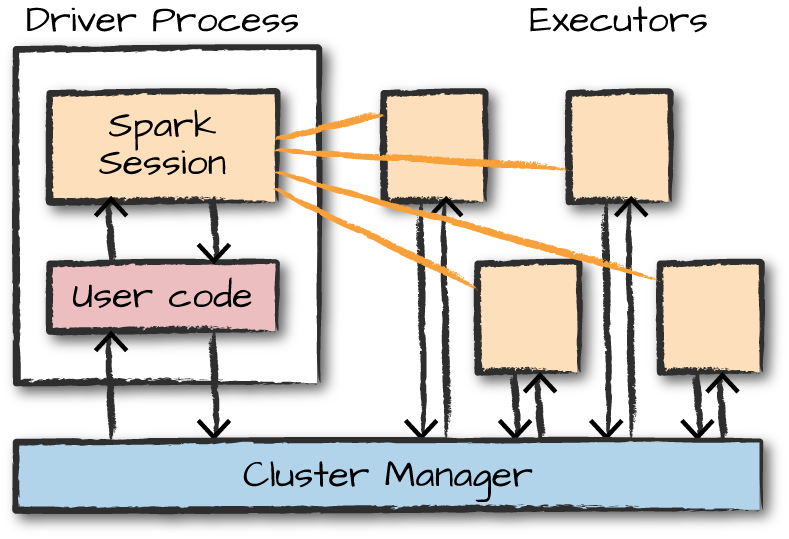 스파크 어플리케이션은 드라이버 프로세스(Driver Process)와 다수의 익스큐터 프로세스 (Executor Process) 로 구성된다.