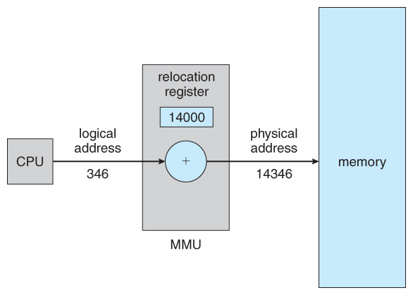 - 사용자 프로세스가 CPU에서 수행되며 생성해내는 모든 주소값에 대해 base register (=relocation register)의 값을 더한다.