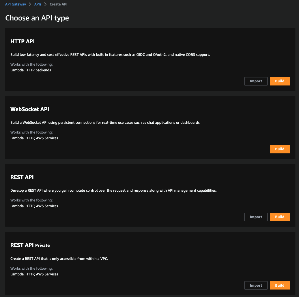 우선 AWS 에서 API Gateway > Create API 를 선택하고, HTTP API 타입을 선택한다.