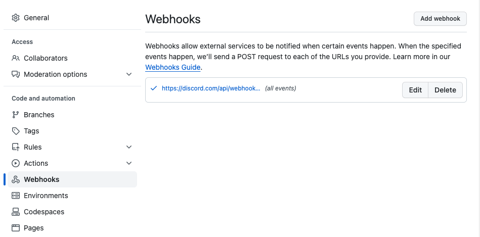 연동에서 웹후크를 선택한 후 새 웹후크를 클릭하면 만들 수 있다.