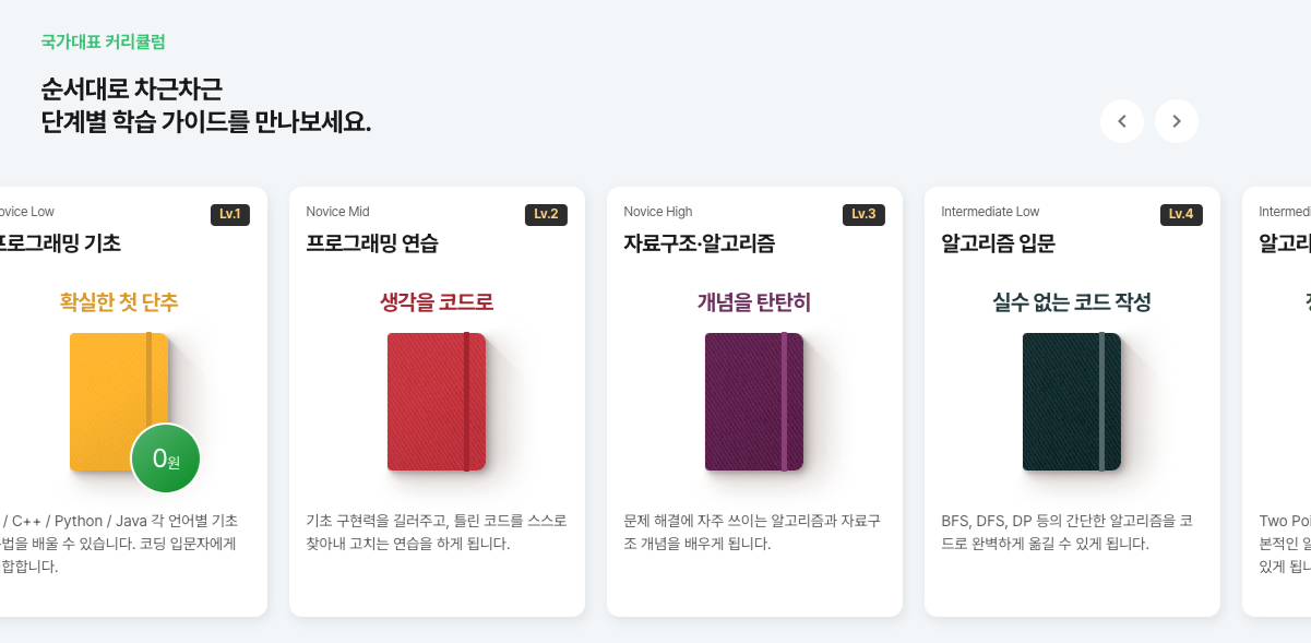 코드트리에서 가장 좋았던 점은 단계별 학습 가이드입니다. 기초 - 연습 - 자료구조,알고리즘 - 알고리즘 입문 - 알고리즘 기본 - 알고리즘 실전 단계로 나뉘어집니다.