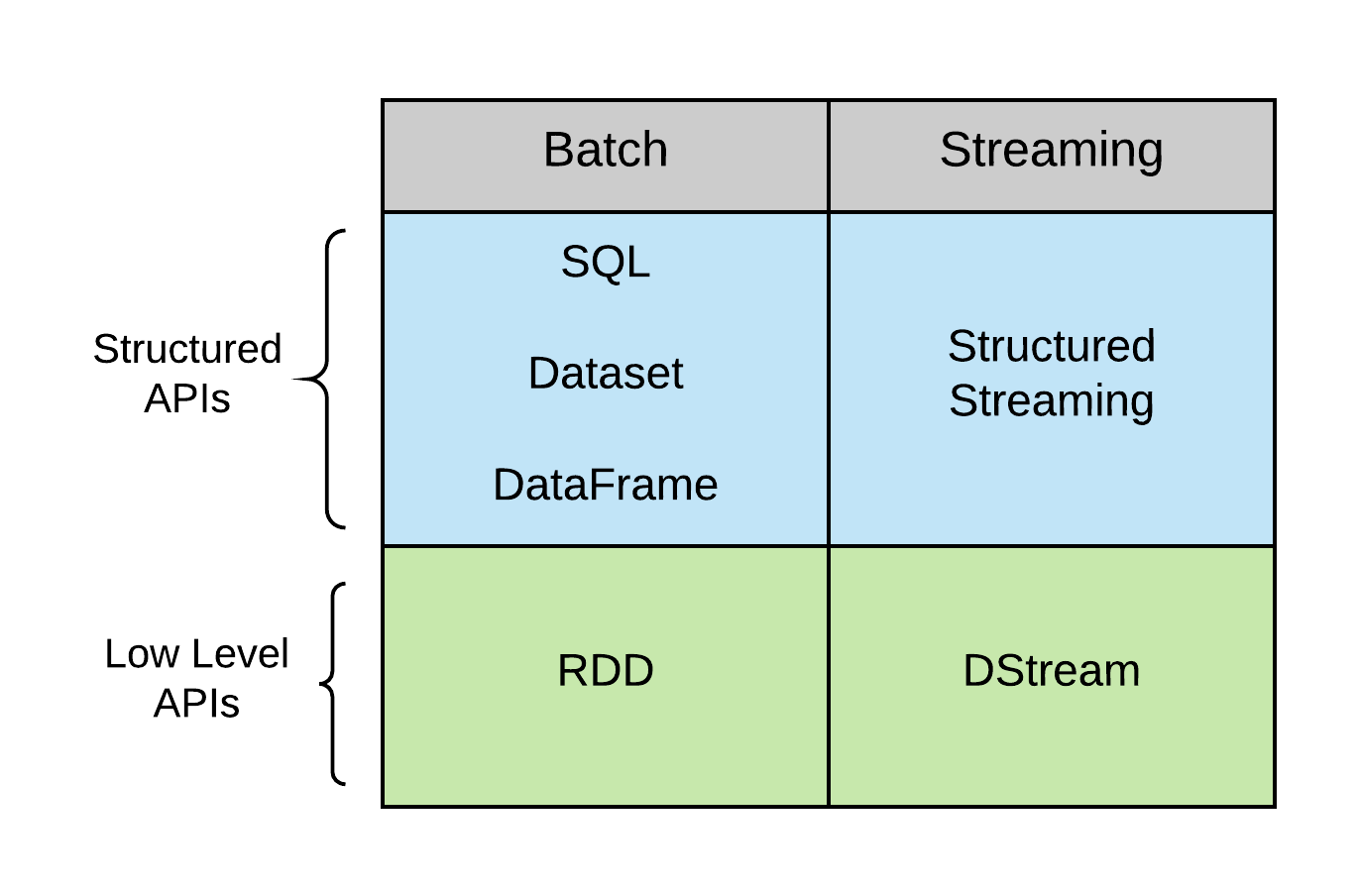 Spark Steaming 은 DStream API (Low Level APIs) 를 기반으로 하며, Spark Structured Streaming 은 Structured API (High Level APIs) 를 기반으로 한다.